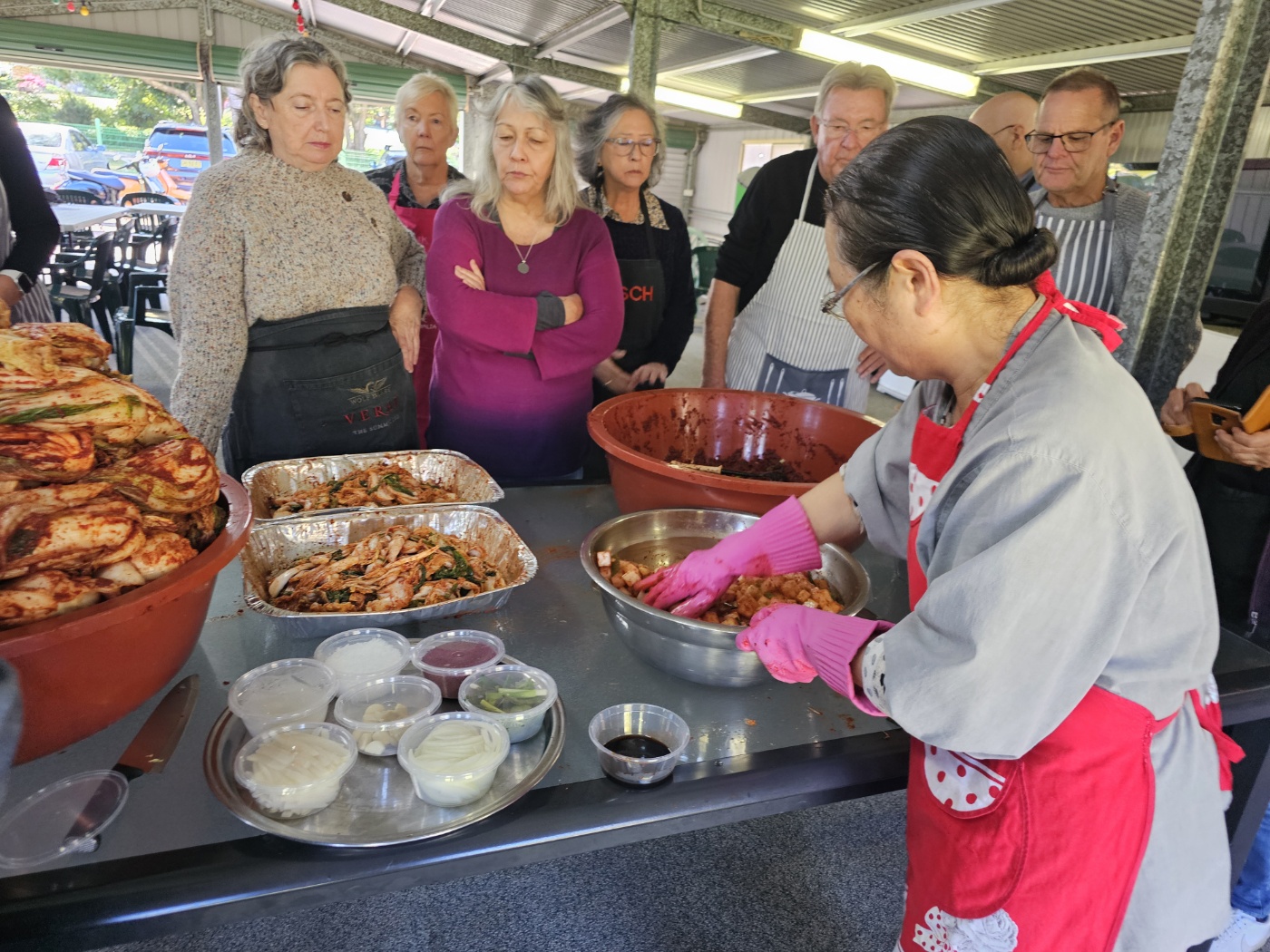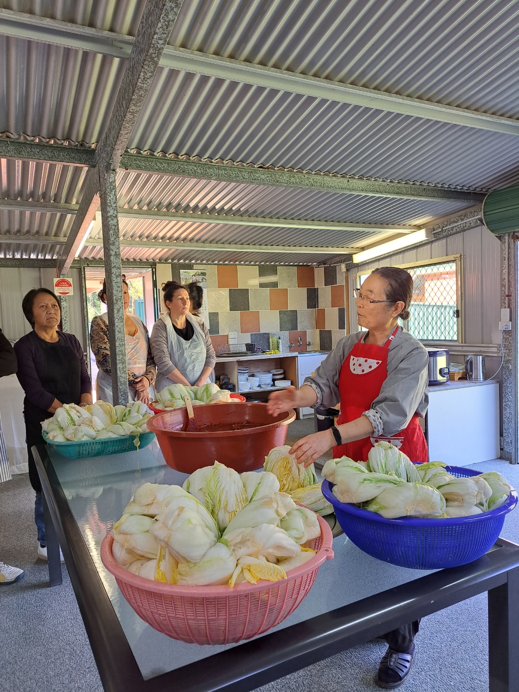 Firstly, we learned how to make Kimch and Radishi Kimch from Rev.Inmyung. She explained the ingredients and demonstrated how to coat cabbage with the paste well.